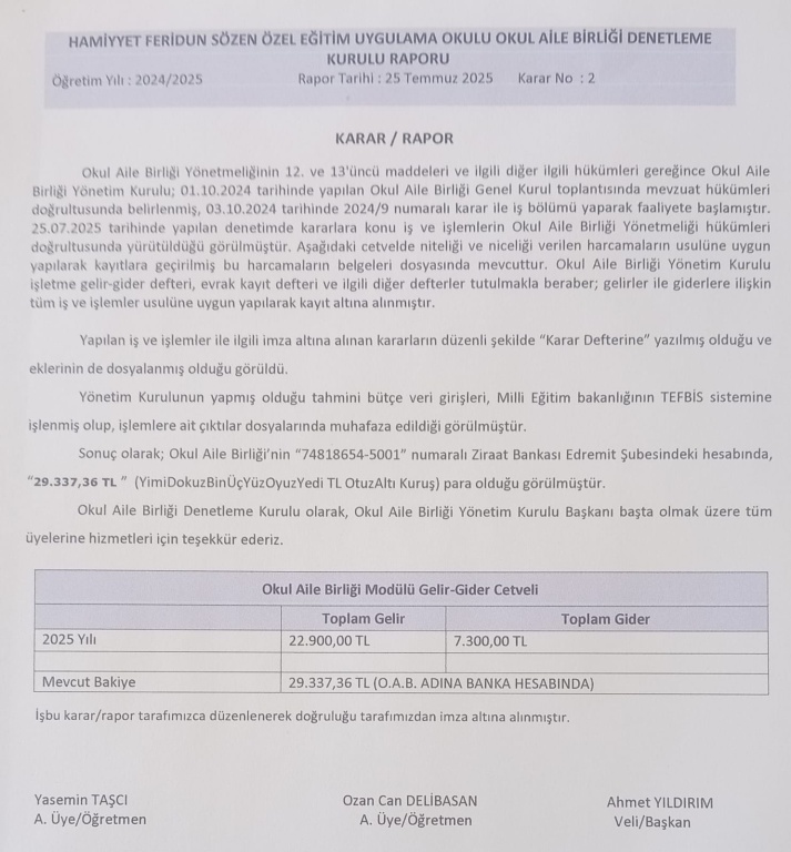 Okul Aile Birliği Denetleme Kurulumuz Yönetim Kurulu faaliyetlerini denetlemişlerdir.